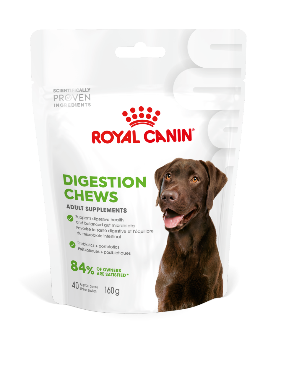 Suppléments pour chien adultes pour favoriser la santé digestive et l’équilibre du microbiote intestinal.