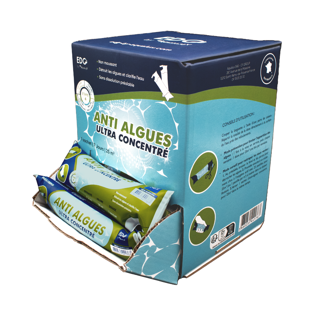 N’est désactivé ni par le chlore (sauf cas de surdosage), ni par le calcaire de l’eau – Prévient l’apparition des algues et les détruit