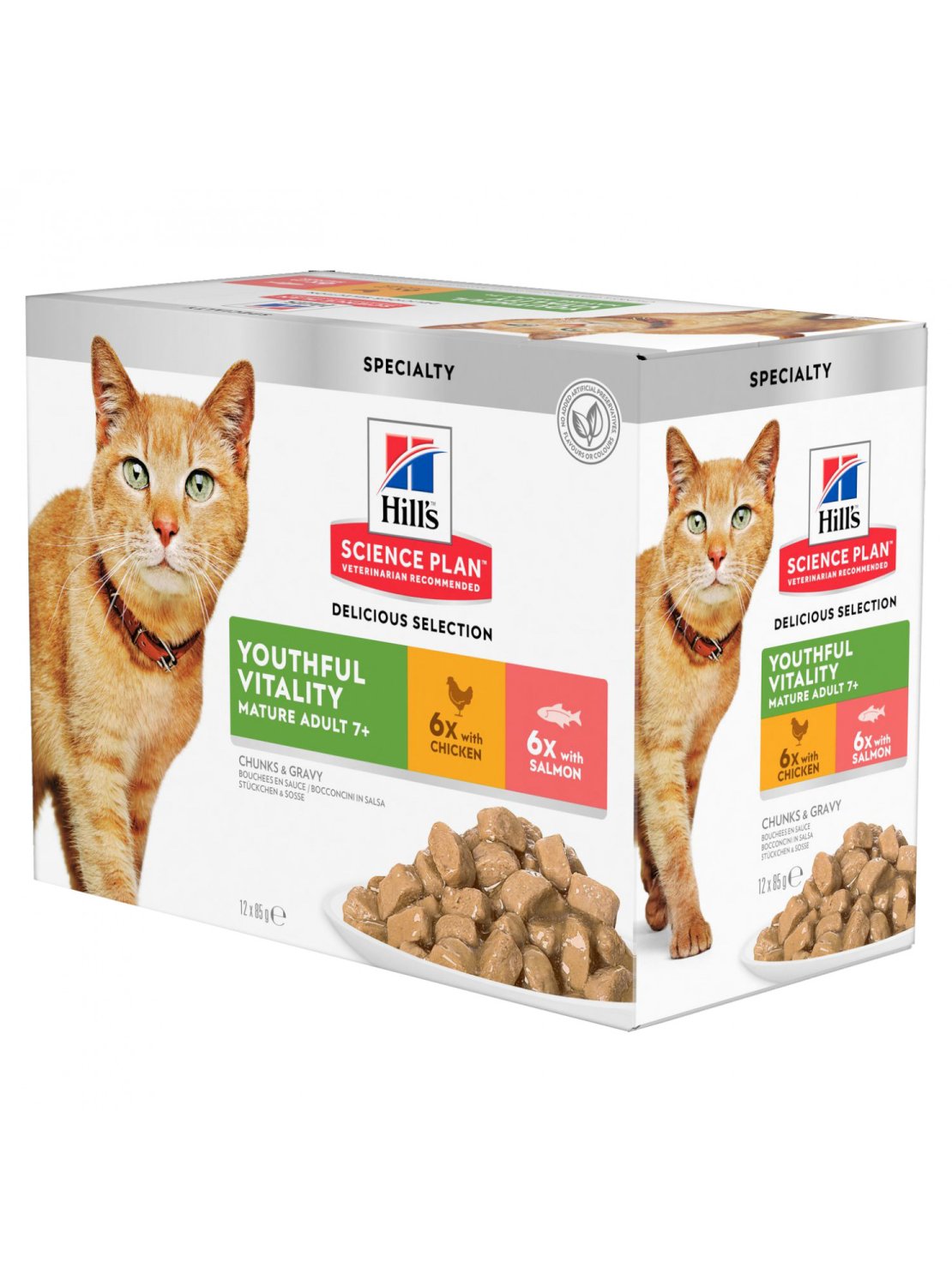 A l’âge de sept ans, les chats atteignent ce que l’on appelle le stade « Mature » de la vie. Les besoins nutritionnels des chats seniors sont différents de ceux des adultes et il est conseillé de changer leur alimentation. Grâce à des teneurs adaptées en vitamines, protéines, matières grasses et minéraux, Hill’s Science Plan Mature Adult 7, permet d’aider votre chat senior à rester jeune plus longtemps. Spécialement formulés pour les besoins des chats vieillissants, les sachets fraicheur Hill’s Science Plan Mature Adult 7, contiennent des protéines de qualité supérieure qui aident à maintenir la masse musculaire des chats âgés de 7 ans et ,. La présence d’antioxydants et de vitamines C,E ralentit le vieillissement cellulaire, maintient les reins en bonne santé et soutient le système immunitaire de votre chat. Cet aliment complet et hautement digestible contient un juste équilibre de tous les éléments nutritifs dont votre chat mature a besoin pour vivre à vos côtés le plus longtemps possible. Ces délicieux sachets fraicheur sont un complément idéal des croquettes Hill’s Science Plan Feline Mature Adult. Ce multipack contient 2 délicieuses saveurs, poulet et poisson, pour varier les plaisirs de votre chat.