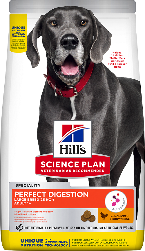Chaque chien abrite un écosystème entier – le microbiome intestinal, rempli de milliards de bactéries désirables et indésirables propres à votre animal. Avec les bons nutriments pour aider à équilibrer leur microbiome, vous pouvez agir non seulement sur leur santé digestive, mais aussi sur leur bien-être général. C’est pourquoi nous avons développé les aliments secs pour chiens Science Plan Perfect Digestion intégrant notre mélange révolutionnaire de prébiotiques, ActivBiome,. Il soutient le microbiome unique de chaque chien pour une digestion saine et un bien-être général.