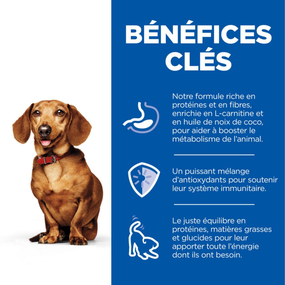 Hill’s Science Plan Perfect Weight Small & Mini Mousse pour Chien Adulte de petite et très petite race à la Dinde est un aliment complet pour chien adulte de petite taille, de 1 an et plus, en discret surpoids ou ayant tendance à prendre du poids. Formulé pour favoriser le maintien durable d’un poids de forme chez les chiens de petite taille. Fabriqué avec notre formule riche en protéines et en fibres, enrichie en L-carnitine et huile de coco, pour favoriser le métabolisme. Cette pâtée pour chien fournit la bonne combinaison de protéines, de lipides et de glucides pour donner aux petits chiens l’énergie dont ils ont besoin, ainsi qu’un puissant mélange d’antioxydants pour favoriser leur système immunitaire. Hill’s Science Plan existe en diverses croquettes et pâtées pour répondre aux besoins uniques de votre chien, avec de nombreuses saveurs délicieuses qu’il va adorer.