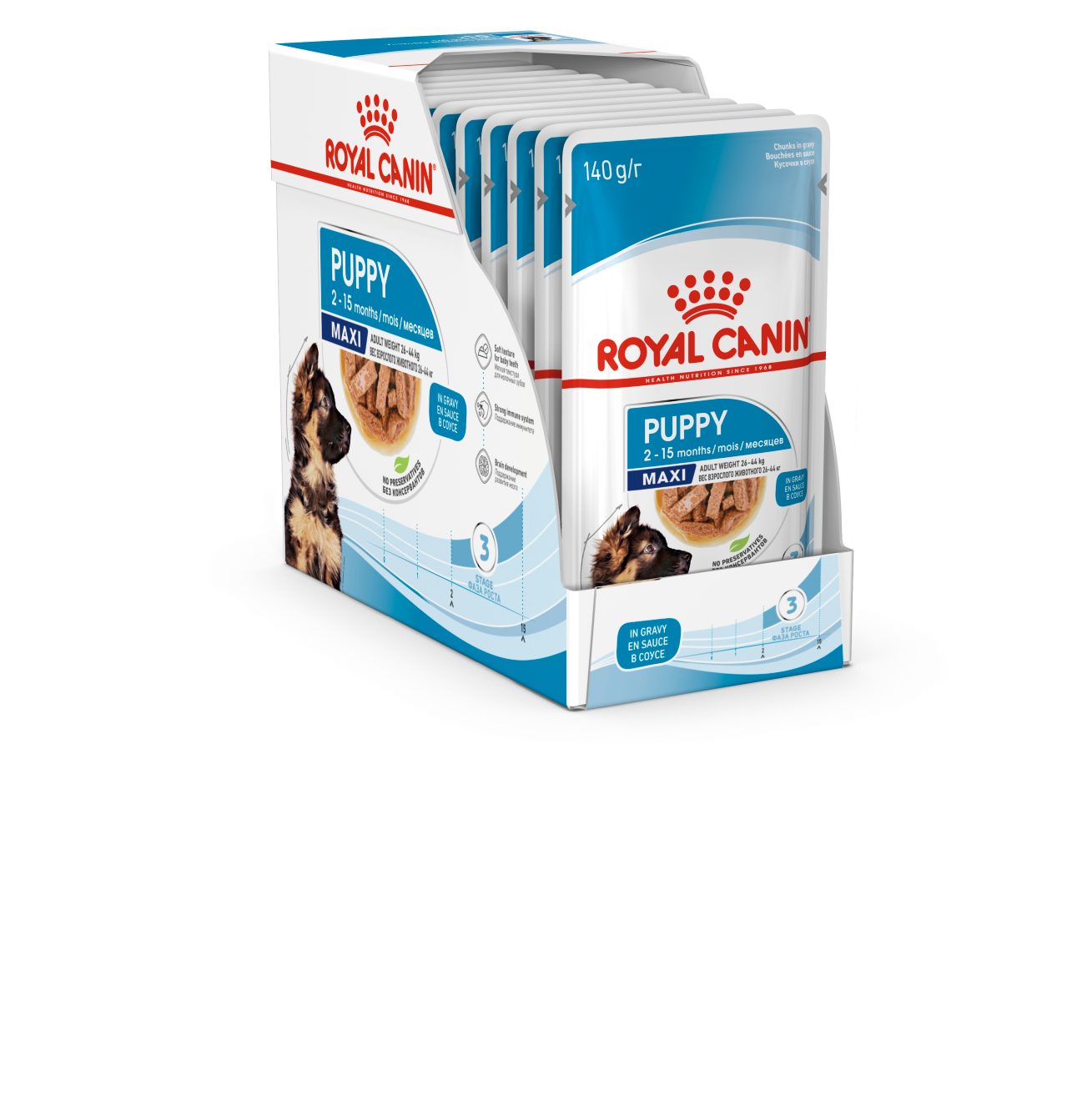 L’aliment humide ROYAL CANIN® Maxi Puppy Sauce est spécialement formulé pour répondre aux besoins nutritionnels des chiots de grandes races. Cette formule convient aux chiots de grandes races âgés de 2 à 15 mois qui devraient atteindre un poids adulte compris entre 26 et 44 kg.