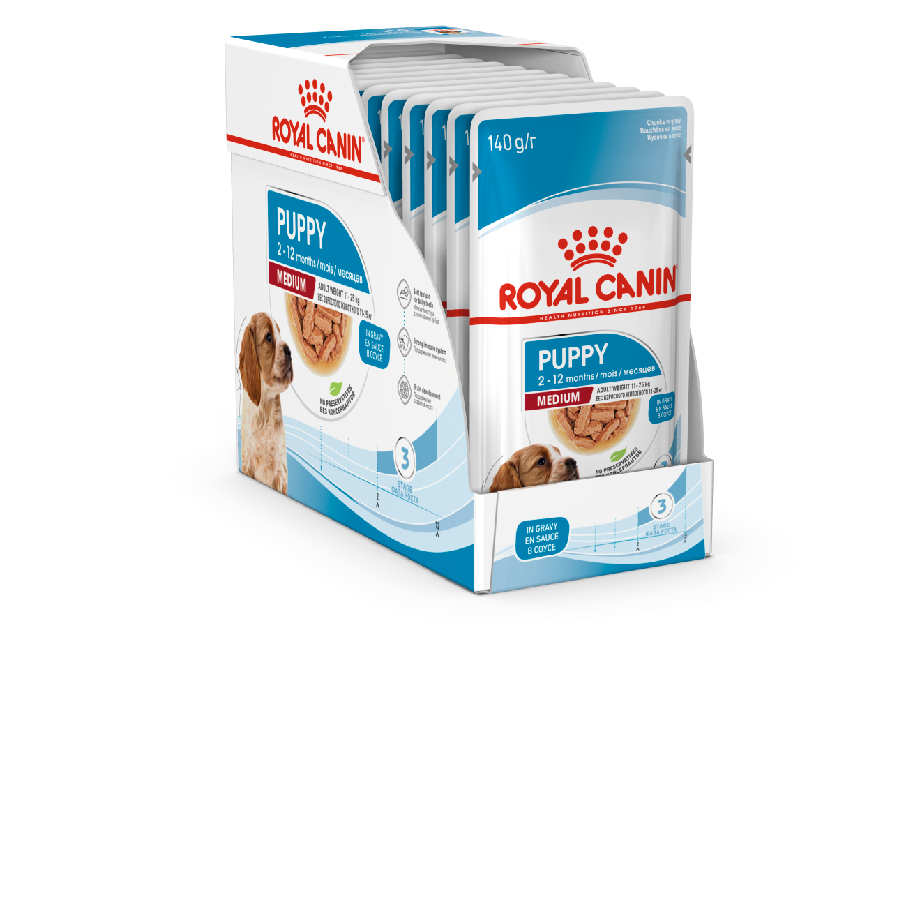 Les tendres bouchées en sauce sont enrichies en acides gras oméga-3 (dont le DHA), scientifiquement prouvés pour contribuer au bon développement cérébral et à la santé visuelle des chiots.
