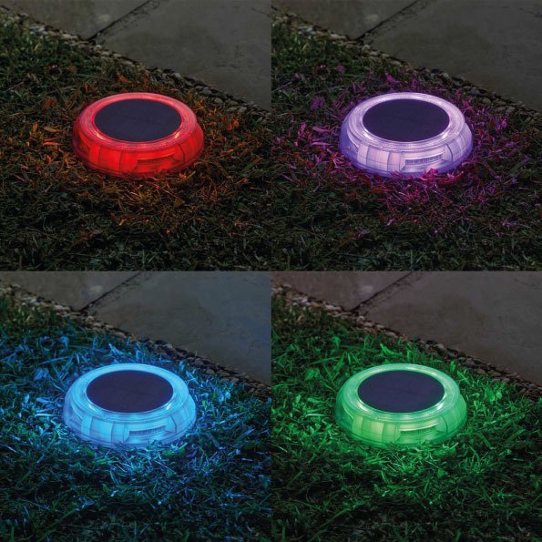 Spot solaire à planter le long des allées et bordures. Deux options d’éclairage: blanc froid ou multi-color. Luminosité de 5 lumens. Plastique – 11.6 x 11.6cm