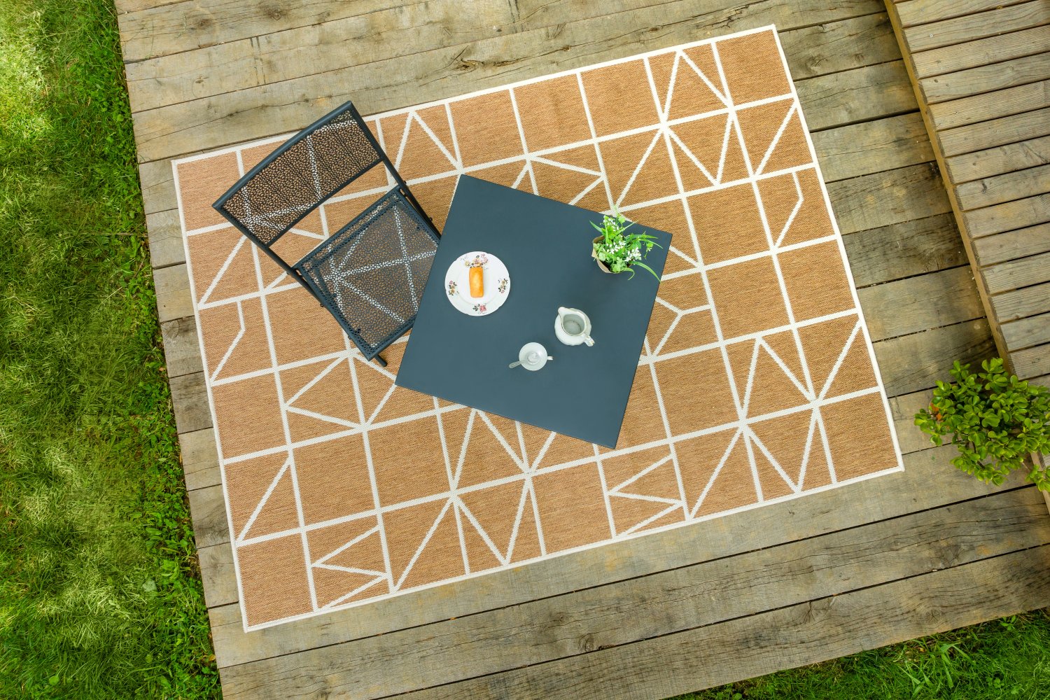 Tapis d’extérieur rond Jacquard Djerba Ø150 cm en polypropylène recyclé, réversible, résistant aux UV et lavable. Parfait terrasse, OEKO-TEX®.